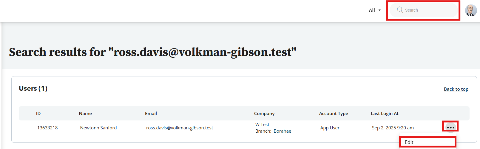 - Search borrower email in Omni Search, and click three dots next to User and select Edit.