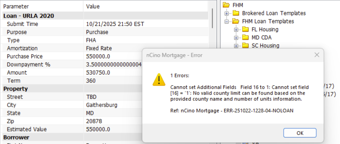 - If the error continues after restarting: Replicate the error and capture the nCino Mortgage Debug Logs from Encompass.