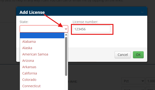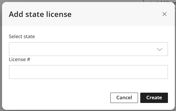 - Add State by selecting a state from the drop down list, enter License number, and click Create.