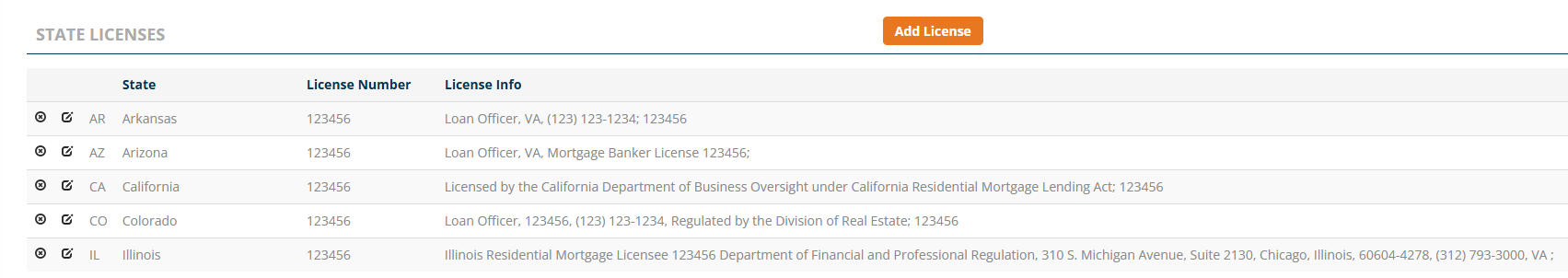 - Once all licenses have been added, scroll back to the State Licenses section to view the complete list of registered licenses.