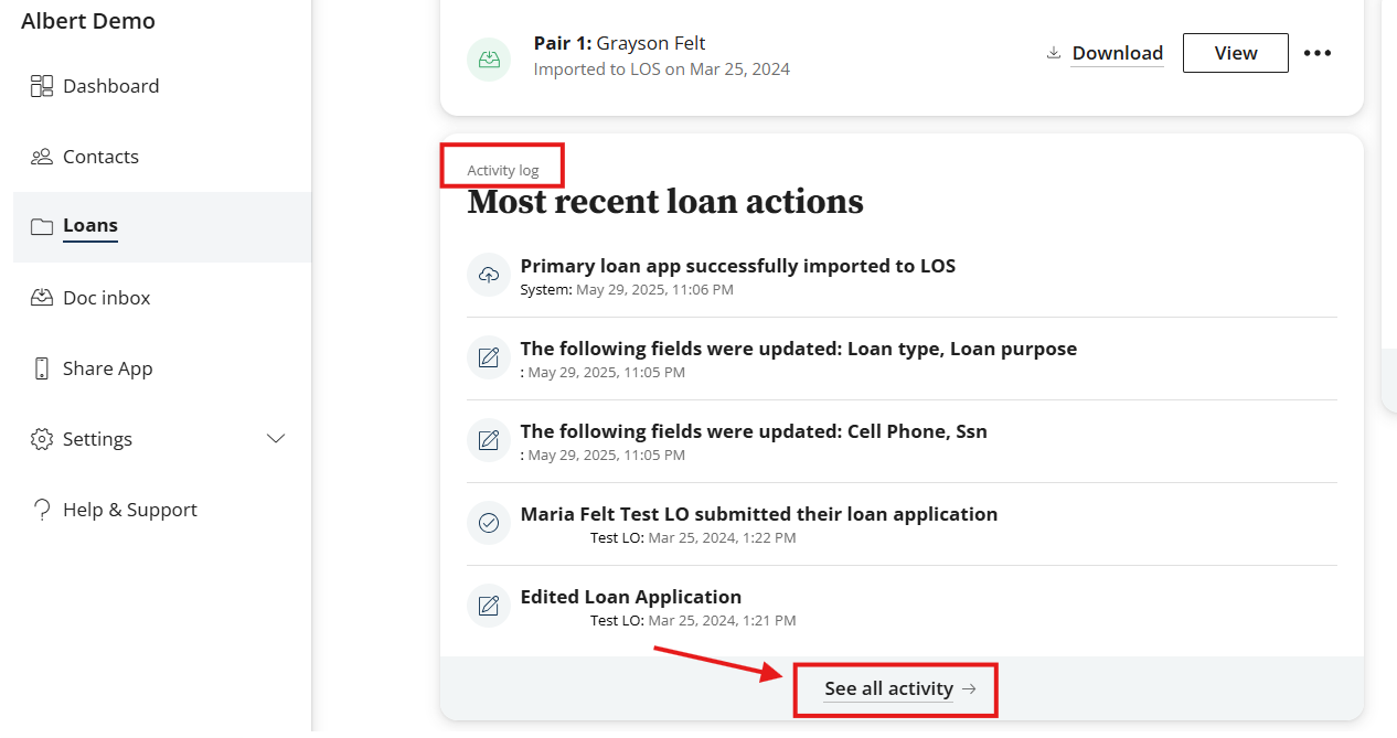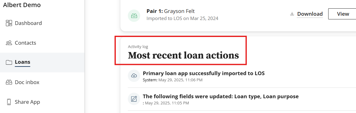 - The Activity log shows a list of the last actions for the loan, as well as search and filter options.