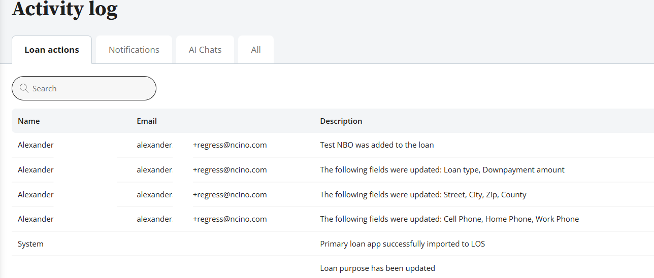 The log also includes any tasks triggered by Encompass (who performed them and what occurred), as well as actions performed via the nCino Mortgage API.