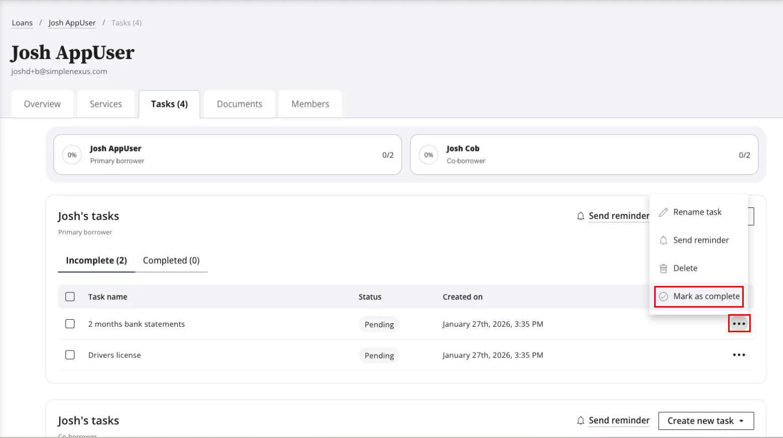 Loan officers and team members can now manually mark certain tasks as complete when borrowers submit required documents through alternative channels such as email, in-person drop-off, or phone calls instead of through the digital workflow. This feature provides operational flexibility for real-world scenarios while maintaining an accurate audit trail of task completion in the system.